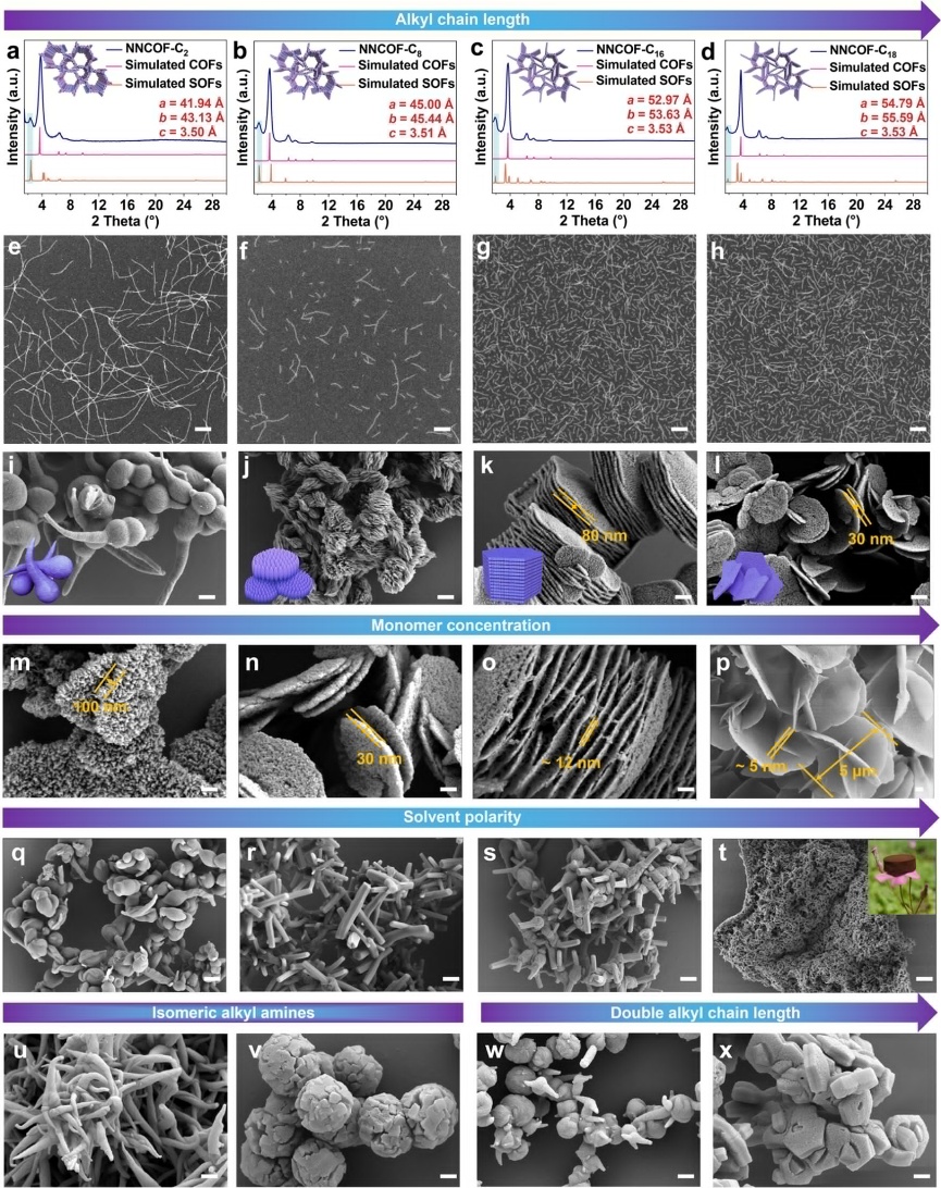 针对上述问题,四川大学马利建/李阳团队在COFs合成中引入烷基胺作为外源性非共价相互作用的来源,首次成功调控了COFs的非经典结晶过程。研究显示,烷基胺引导初始动力学自组装形成亚稳中间态一维纳米管,显著延长了动力学组装阶段,使结晶过程更为可控。这些纳米管通过烷基链间的非共价作用进一步有序聚集,形成超分子有机框架(SOFs),并在后续热力学可逆阶段逐步转化为高结晶度、高孔隙率的COFs。团队系统揭示了外源性非共价相互作用与内源性共价及π-π相互作用之间的协同竞争机制,并借助时间依赖的形貌表征技术,首次观测到COFs经历“种子—萌芽—生长—成熟”的拟态化过程。