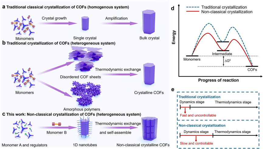 共价有机框架(Covalent organic frameworks, COFs)作为一类由可逆共价键连接的晶态多孔材料,因其结构可调、孔隙有序等特性,在气体储存、催化、分离及能源等领域展现出广阔应用前景。传统COFs结晶通常遵循经典的“单体逐层添加”模式,然而其快速动力学成核过程难以观测与调控,限制了对其结晶机制的理解与材料性能的精准设计。非经典结晶理论指出,结晶过程中可能存在更大的中间体通过非共价相互作用进行定向或随机附着,进而形成超结构,这为理解和调控COFs结晶提供了新视角。然而,如何在COFs体系中实现非经典结晶路径的可控引导,阐明并调控其非经典结晶机制,仍是该领域面临的挑战。