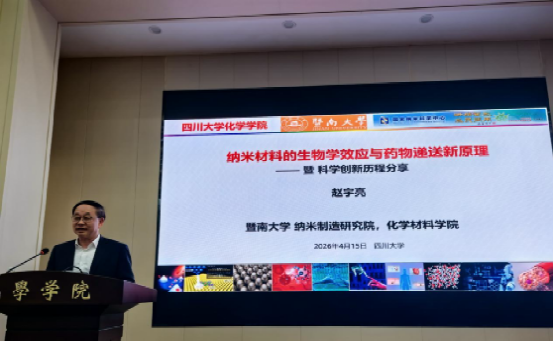 2026年4月15日下午,暨南大学赵宇亮院士应邀到我校进行学术交流,做客我院银杏大讲堂,为化学学院师生带来了一场题为《纳米材料生物效应与药物递送新原理》的精彩学术报告。由吕弋院长主持,化学学院师生参加了报告会。