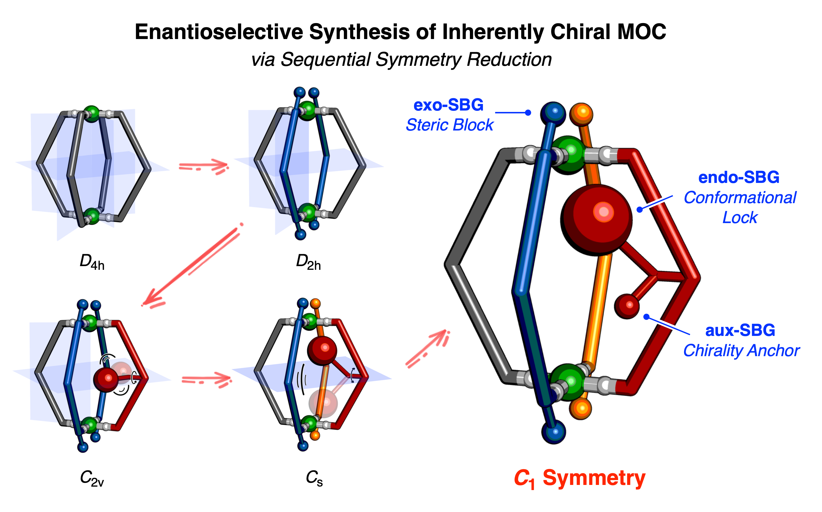 近日,四川大学化学学院张琦课题组利用逐步对称破缺的策略,首次实现具有固有手性的C1对称超分子笼的对映选择性合成。该研究以D4h对称的Pd2L4金属有机笼为起点,通过依次引入一个腔外和两个腔内对称性破坏基团(SBG),系统地将对称性降低至D2h、C2v、Cs,最终获得C1对称结构。其中,腔内SBG带有中心手性,能够将手性有效地传递至整个笼状框架,从而驱动对映选择性组装。密度泛函理论计算与变温核磁共振实验进一步揭示了手性诱导的机理。通过更换不同的腔内SBG及内部官能团,成功构建了一系列具有手性空腔的结构,证明了该策略的通用性。初步的主客体研究表明,该类手性空腔能够结合中性及阴离子客体分子。空腔固有的不对称性可实现对手性客体的区分,并且其选择性可通过在空腔内引入小官能团进行精细调控。本研究发展了一种构建高度不对称限域纳米空间的普适性方法,为不对称催化与分子识别等领域提供了新的研究思路。